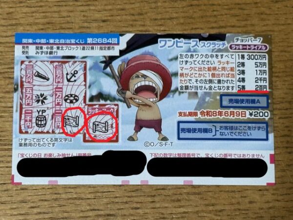 左の赤ワクの中をすべてけずってください ラッキーマークに出た絵柄と同じ絵柄がどこかに1個出れば当たりで、その左側に書かれた金額が当せん金となります。